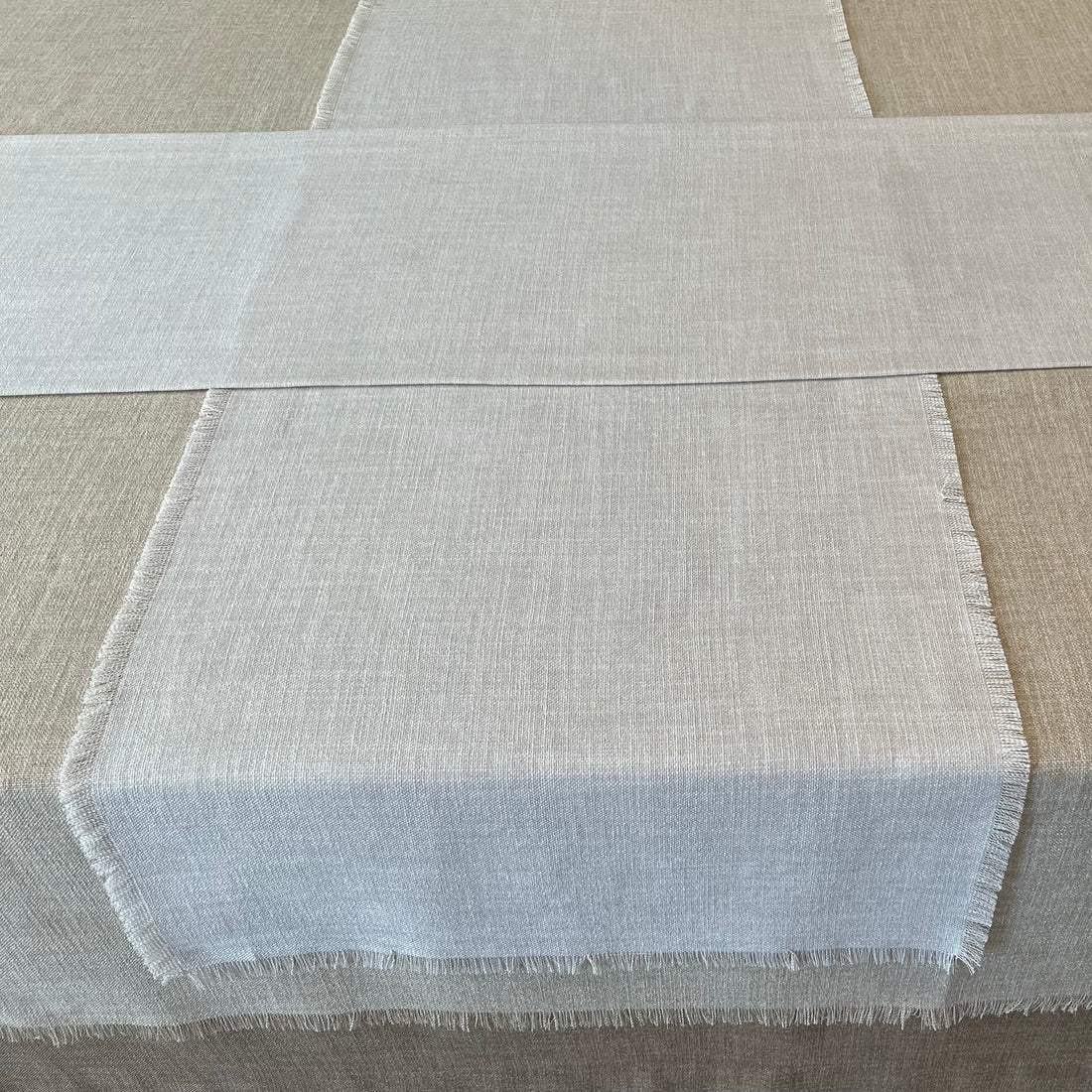 Define your table top with the layering of runners, lengthwise and across to create clean...