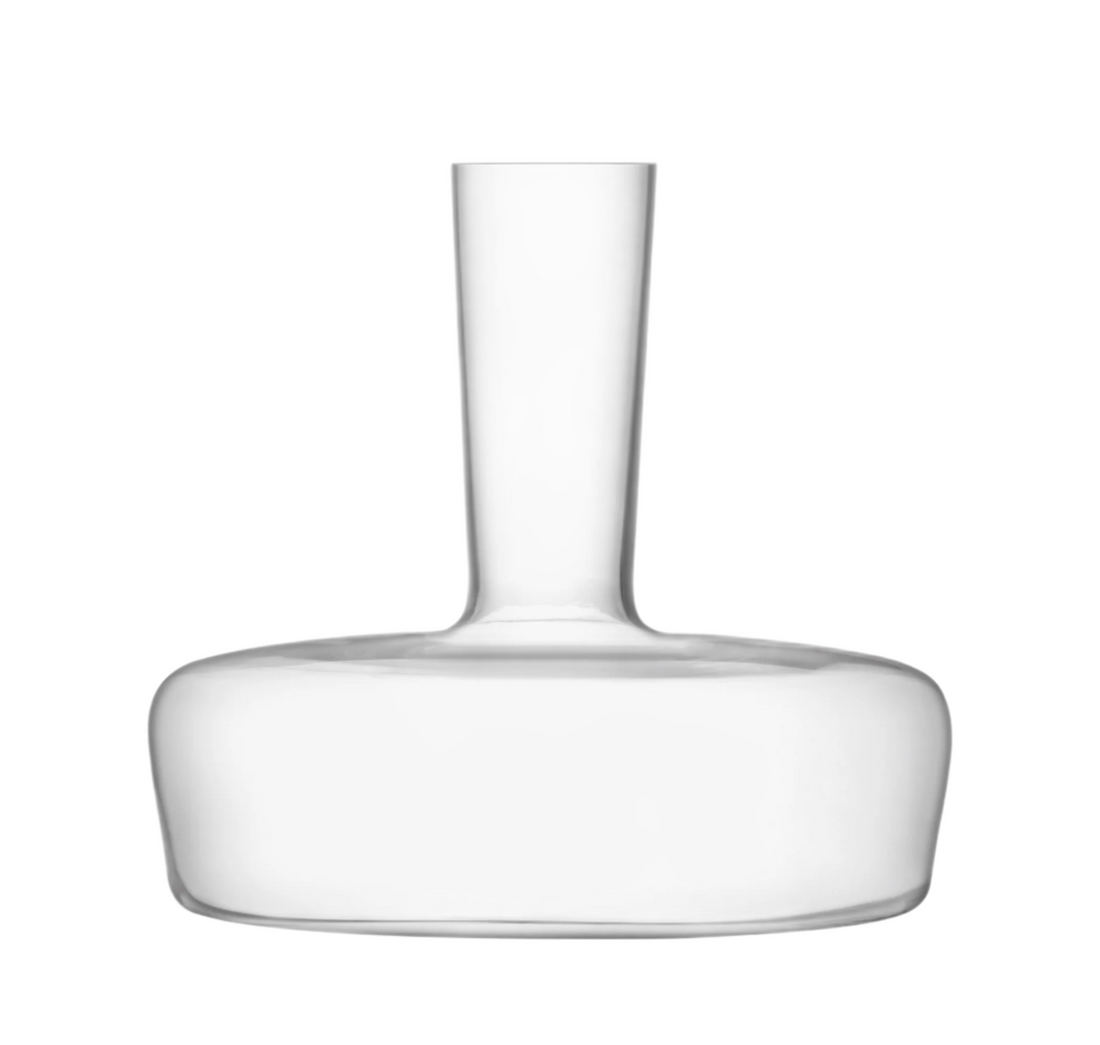 A contemporary mouth-blown wine carafe with an angular profile, tapered neck and flat, polished rim....
