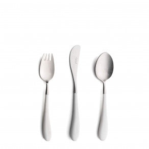 Designed for those who begin table rituals, Alice is the first step to not change the fork in the left hand with the knife in the right. Subtly ergonomic set of 3 pieces, with a resin handle available in different colours.