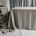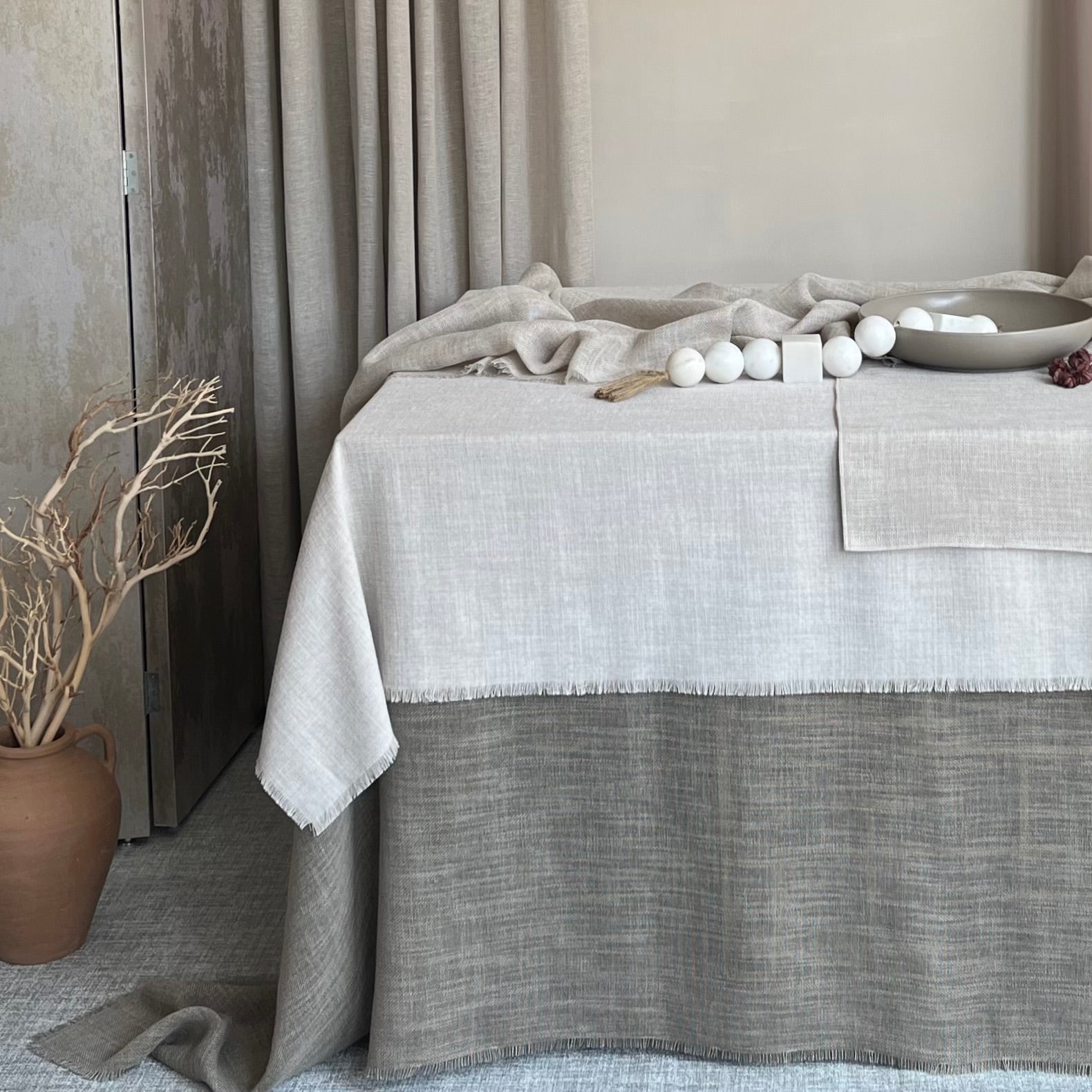 New for fall is our oversized burlap mesh tablecloths that run dramatically to the floor, layered with our nomad heather linen tablecloth.  All easy care of course!