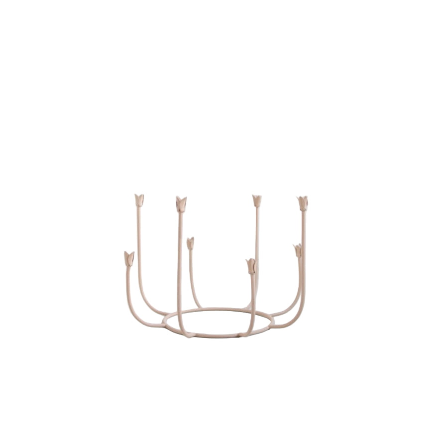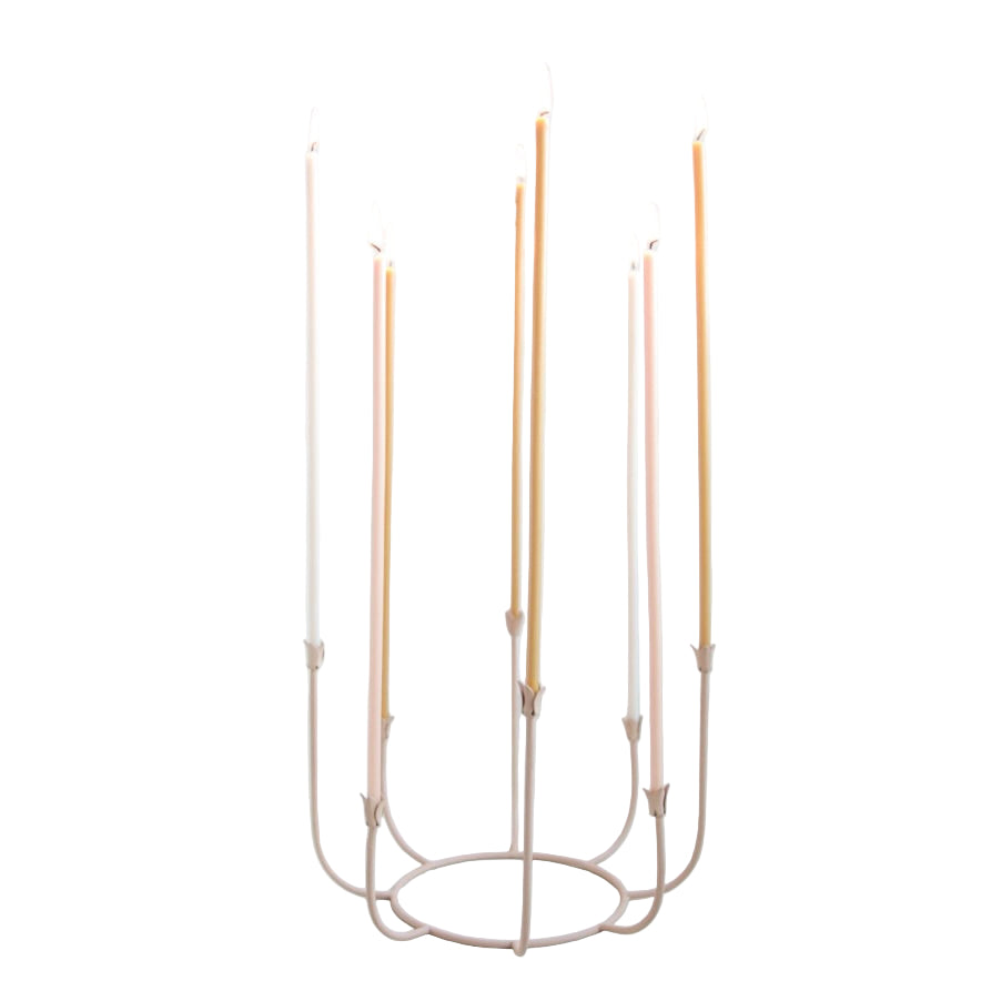 Inspired by wrought iron garden gates, the Beacon Long Stem Candelabra holds eight Long Stem Candles with curved stems and tulip candle cups. Each candelabra is entirely handmade using traditional methods. Imperfections are to be celebrated. Gently press or pinch candle cups to secure tapers as needed.