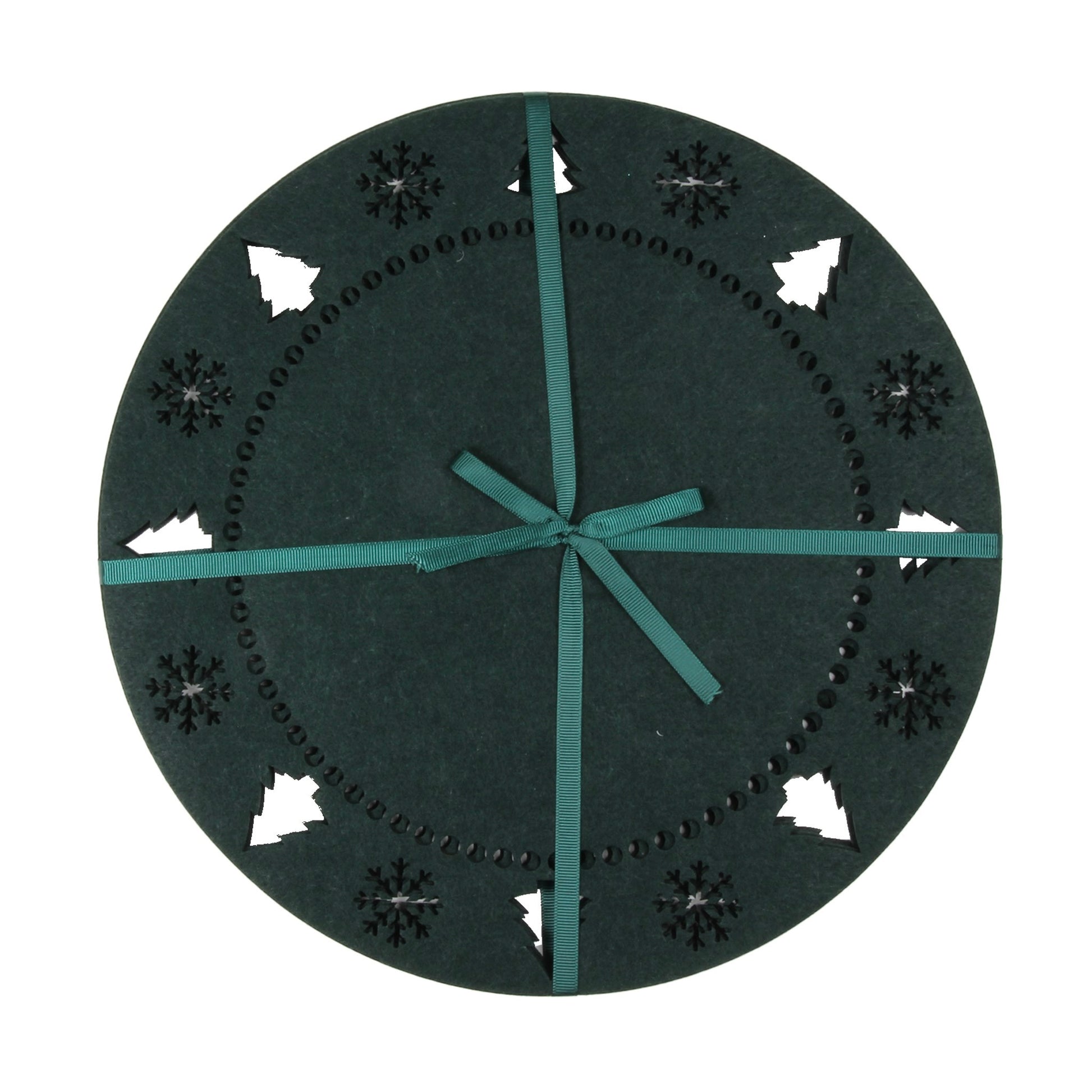 Add a playful holiday touch to your table with this round felt placemat featuring cutout snowflakes and Christmas trees. The intricate cutout design lets your table surface peek through, creating a festive layered look while protecting your tabletop. Perfect for holiday dinners, casual gatherings, or simply adding seasonal cheer to everyday meals.
