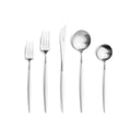 Set consists of dinner knife, dinner fork, table spoon, dessert fork and dessert spoon.