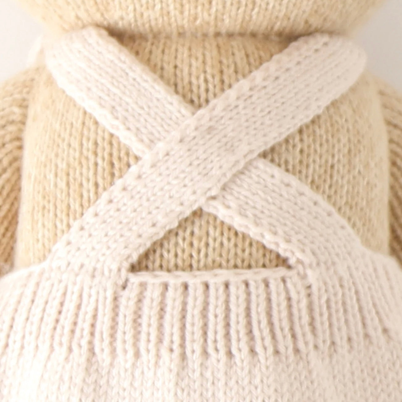 Hand knit with premium 100% cotton yarn with premium felt and knit details. Each doll is stuffed with hypoallergenic polyfill to be the ideal cuddle weight.