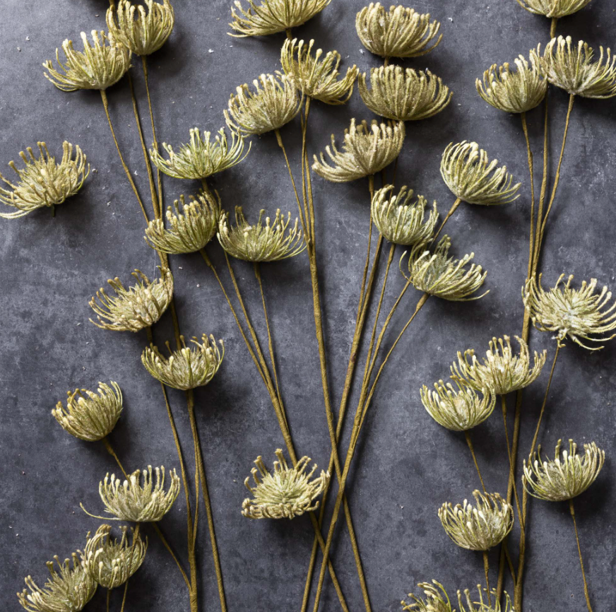 Simply a delight to the eye, we can't get enough of the characterful look of the Artificial Leucospermum Blush. Topped with three textural heads in a beautiful, soft green hue, it's a fabulous stem to punctuate a bouquet of faux flowers in softer silhouettes like hydrangeas. roses.