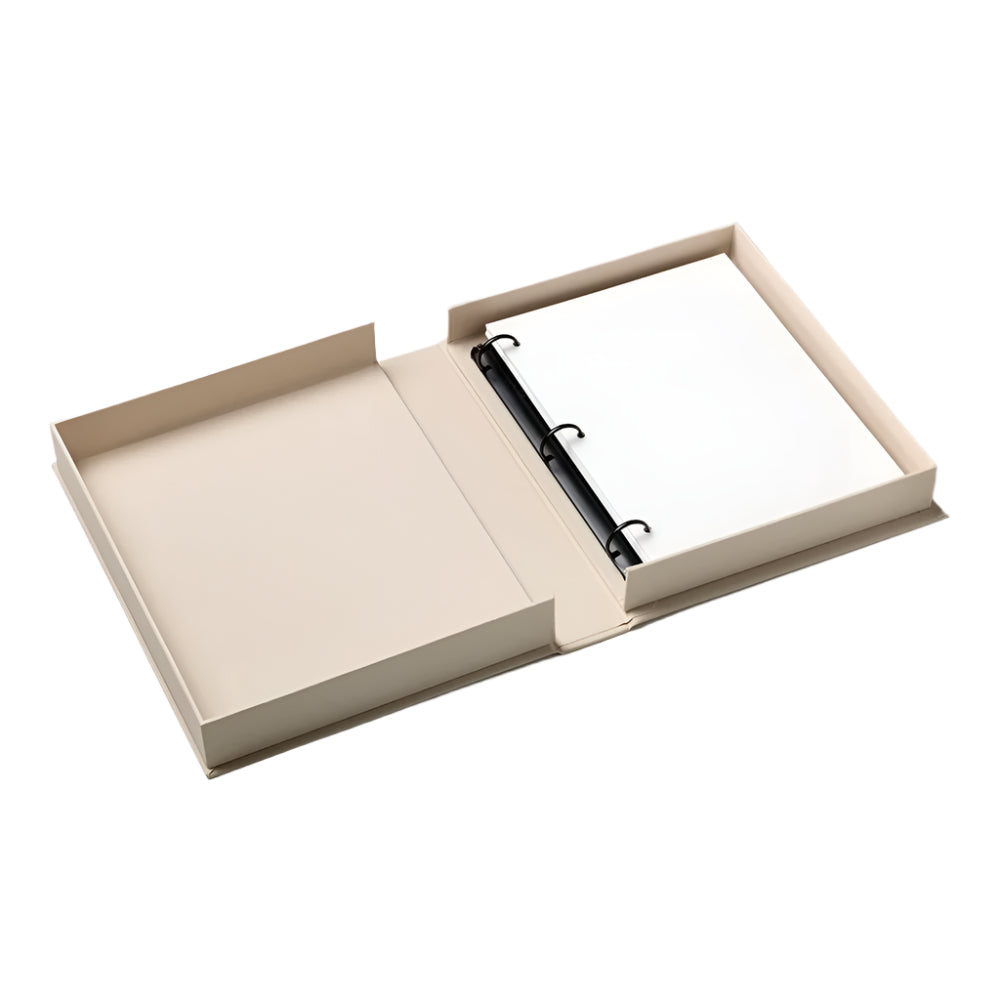 Material: Cover: 100% Cotton fabric + recycled greyboard. Pages FSC, acid free black card. Black metal binder.