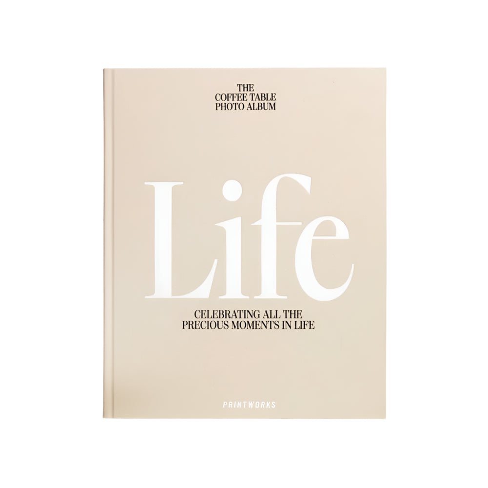 Discover the beautiful Coffee Table Photo Album, 'Life', featuring an elegant beige cloth cover with white text. Inside, you'll find 30 pages of high-quality white photo paper, allowing you to attach your photos easily using stickers or photo corners. It accommodates two 10x15 cm photographs on each page, with space for personal notes below. Please note that the album can accommodate a maximum of 40 pages. The photo paper size is 28x21 cm.