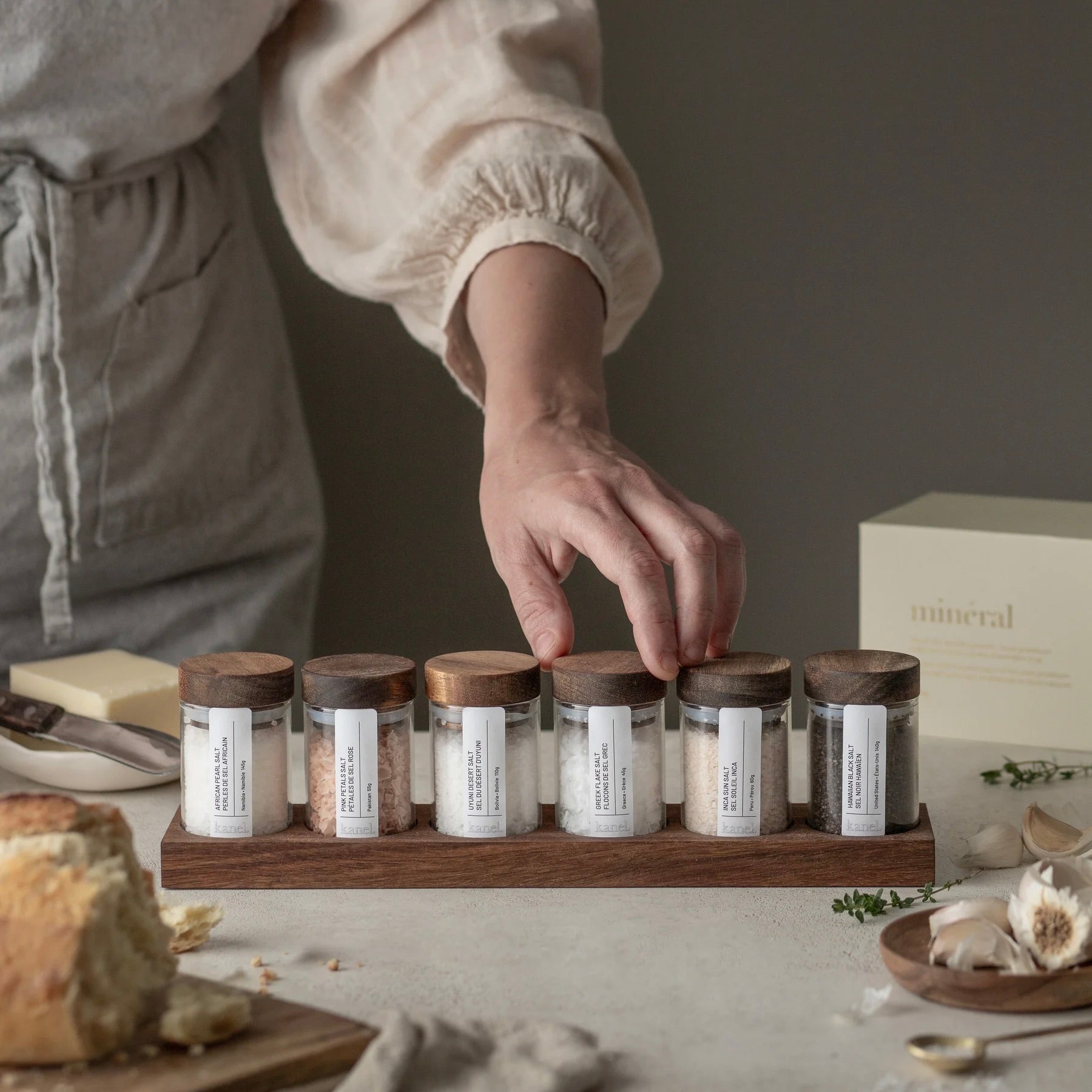 Introducing Minéral, six of the most brilliantly pure salts from around the world. We scoured the globe to bring you this unique collection, presented in custom glass jars with handmade acacia lids and serving tray.