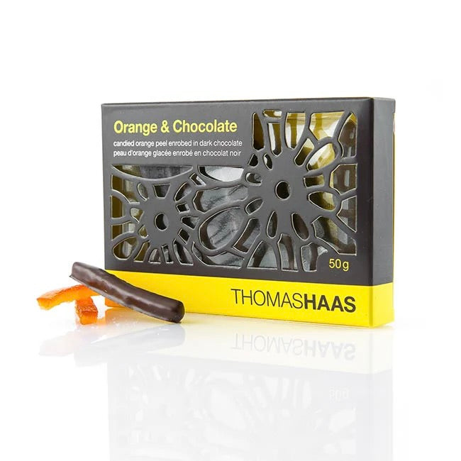 Handcrafted in Vancouver by master chocolatier Thomas Haas, this indulgent treat features candied orange peel covered in dark chocolate. The vibrant citrus notes complement the rich, smooth chocolate, creating a refined and decadent indulgence perfect for any chocolate lover.