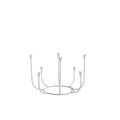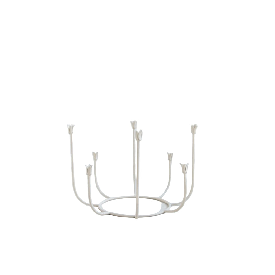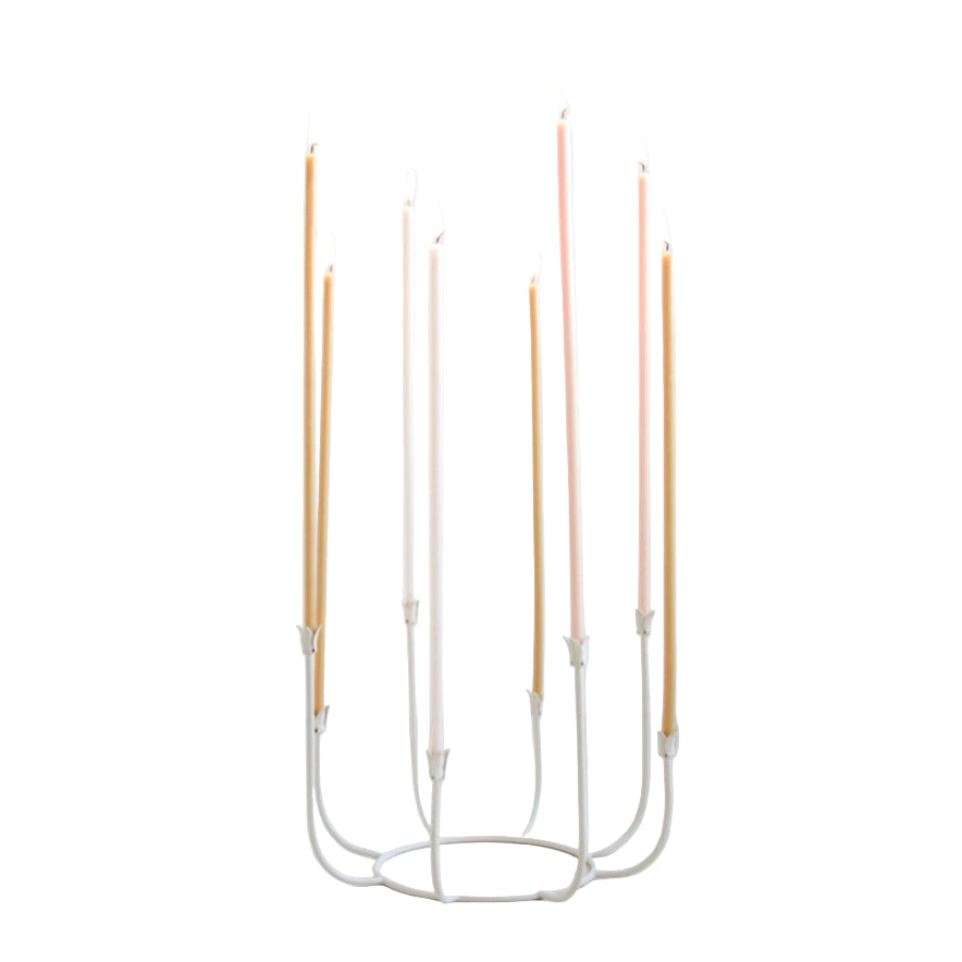 Inspired by wrought iron garden gates, the Beacon Long Stem Candelabra holds eight Long Stem Candles with curved stems and tulip candle cups. Each candelabra is entirely handmade using traditional methods. Imperfections are to be celebrated. Gently press or pinch candle cups to secure tapers as needed.