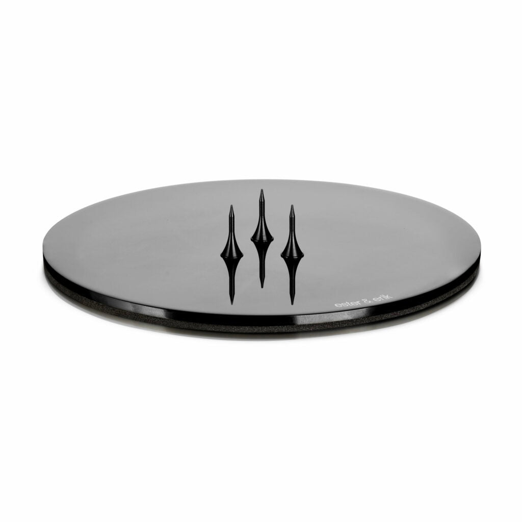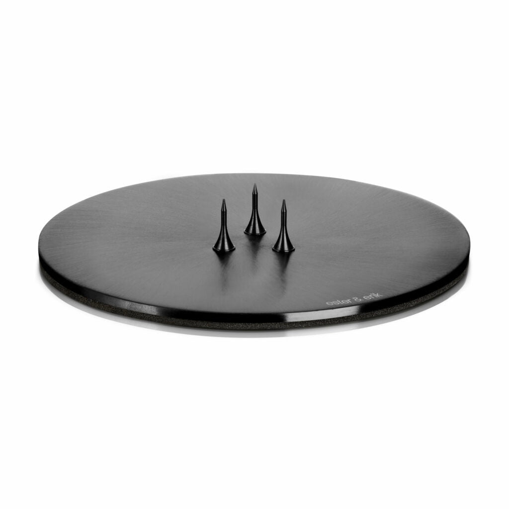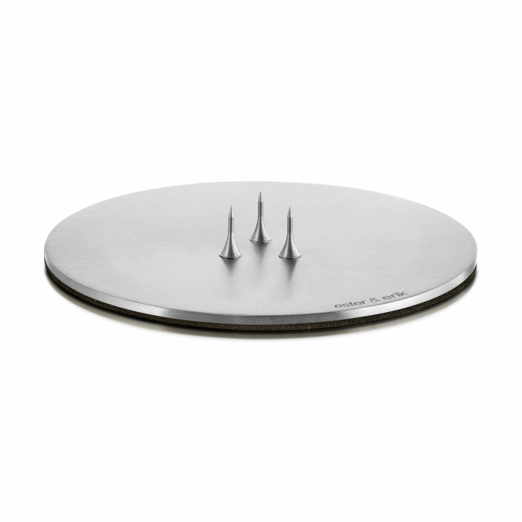Ester + Erik's round plates are simply and stylishly designed, and go well with all their handmade candles. The plates are mainly used with their beautiful cone and pillar candles. The candle is held in place by three spikes, so that all candles sit securely. In addition, the plate has a foam backing to protect the underlying surface.