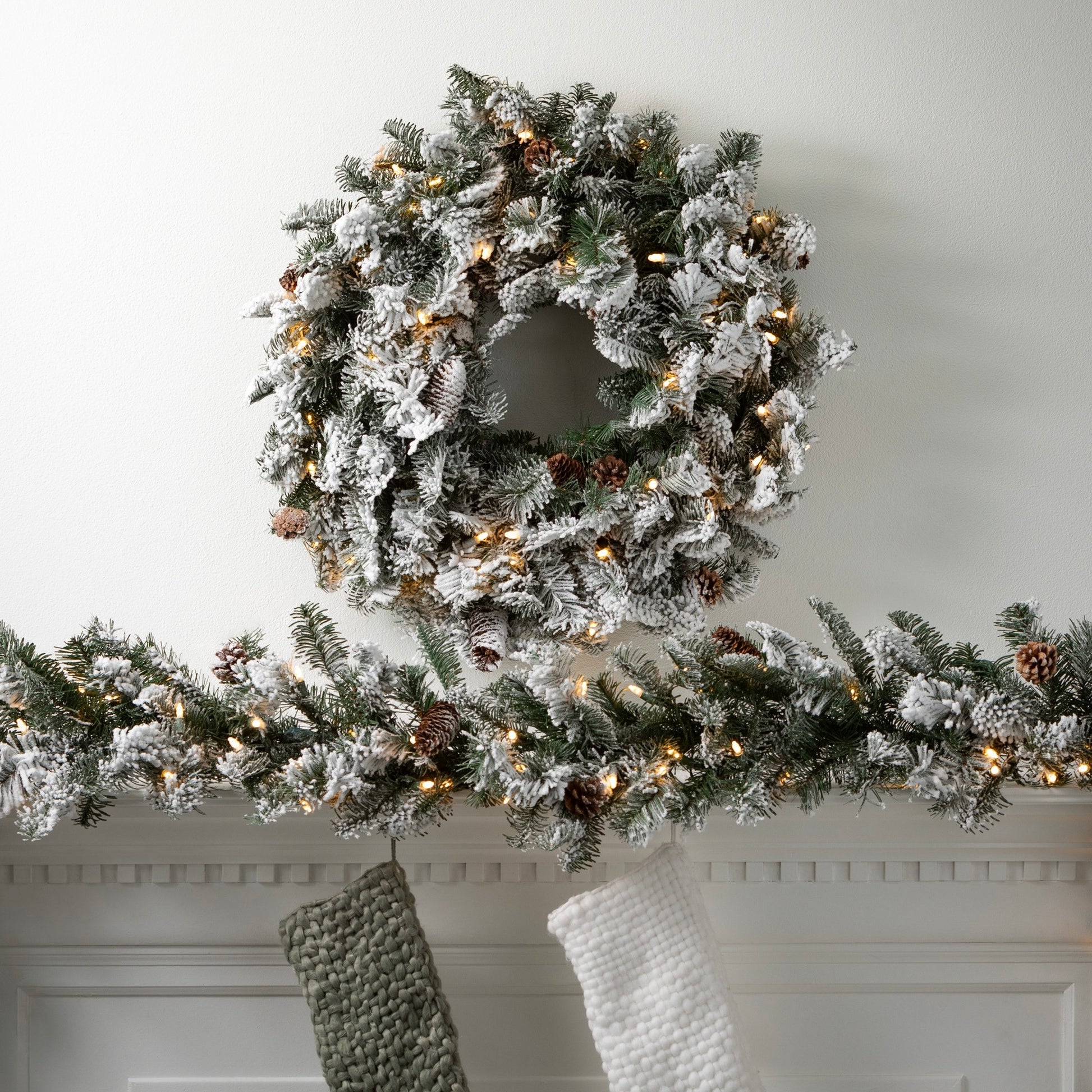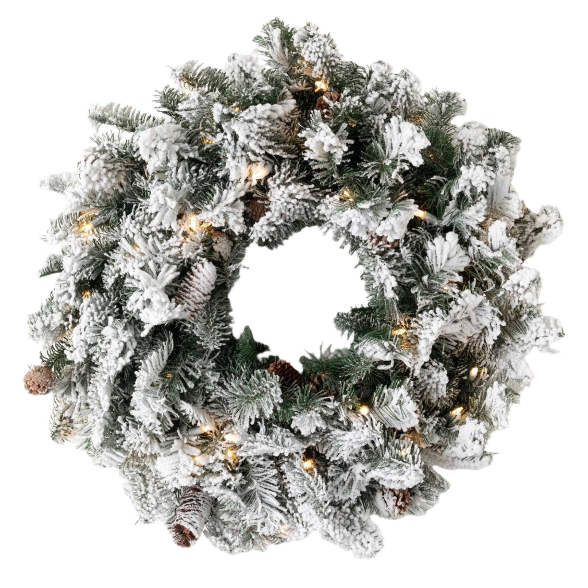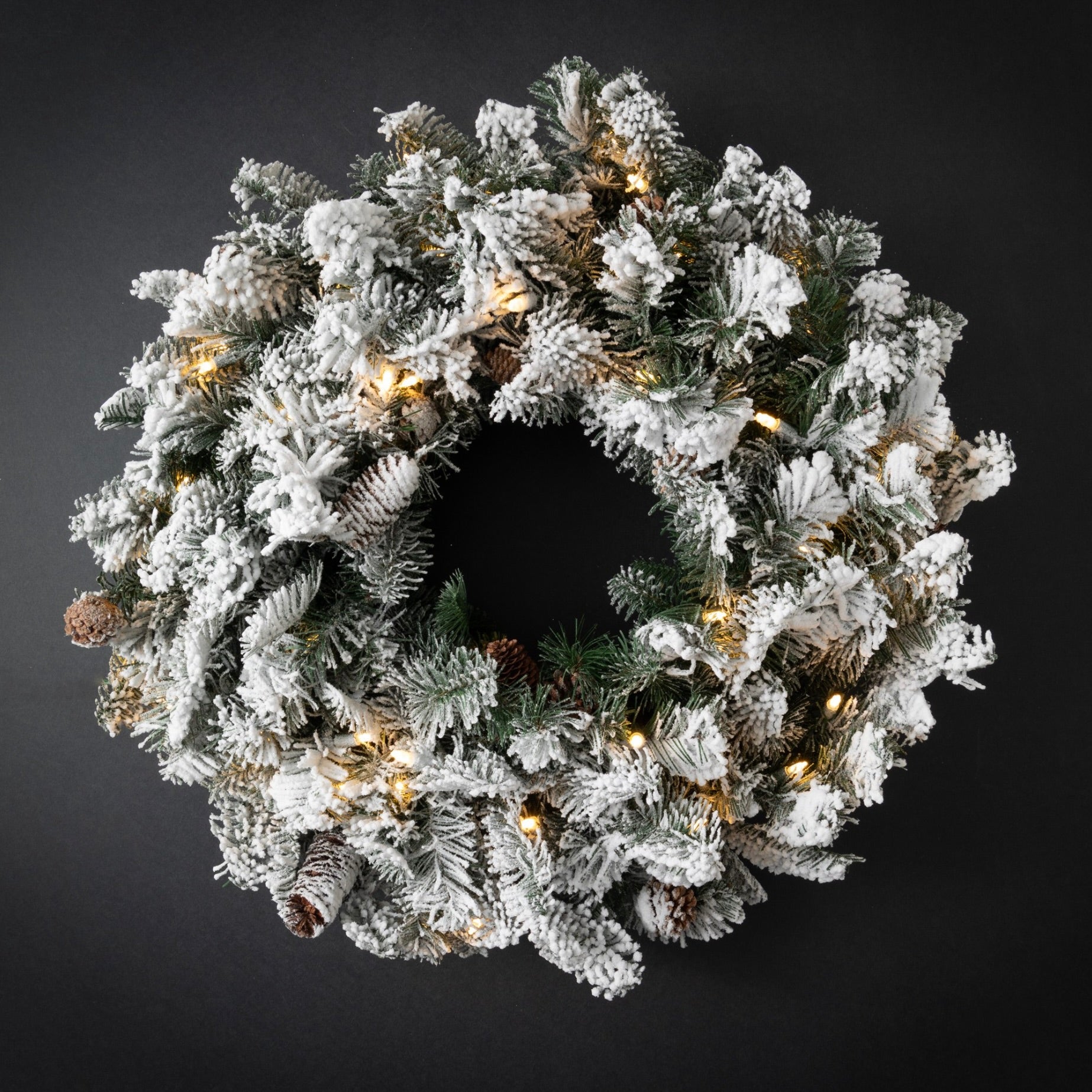 A beautiful and festive addition to any holiday decor. Perfect for decorating your front door or mantel. Wreath comes pre lit, featuring beautiful snowy branches with pinecones.