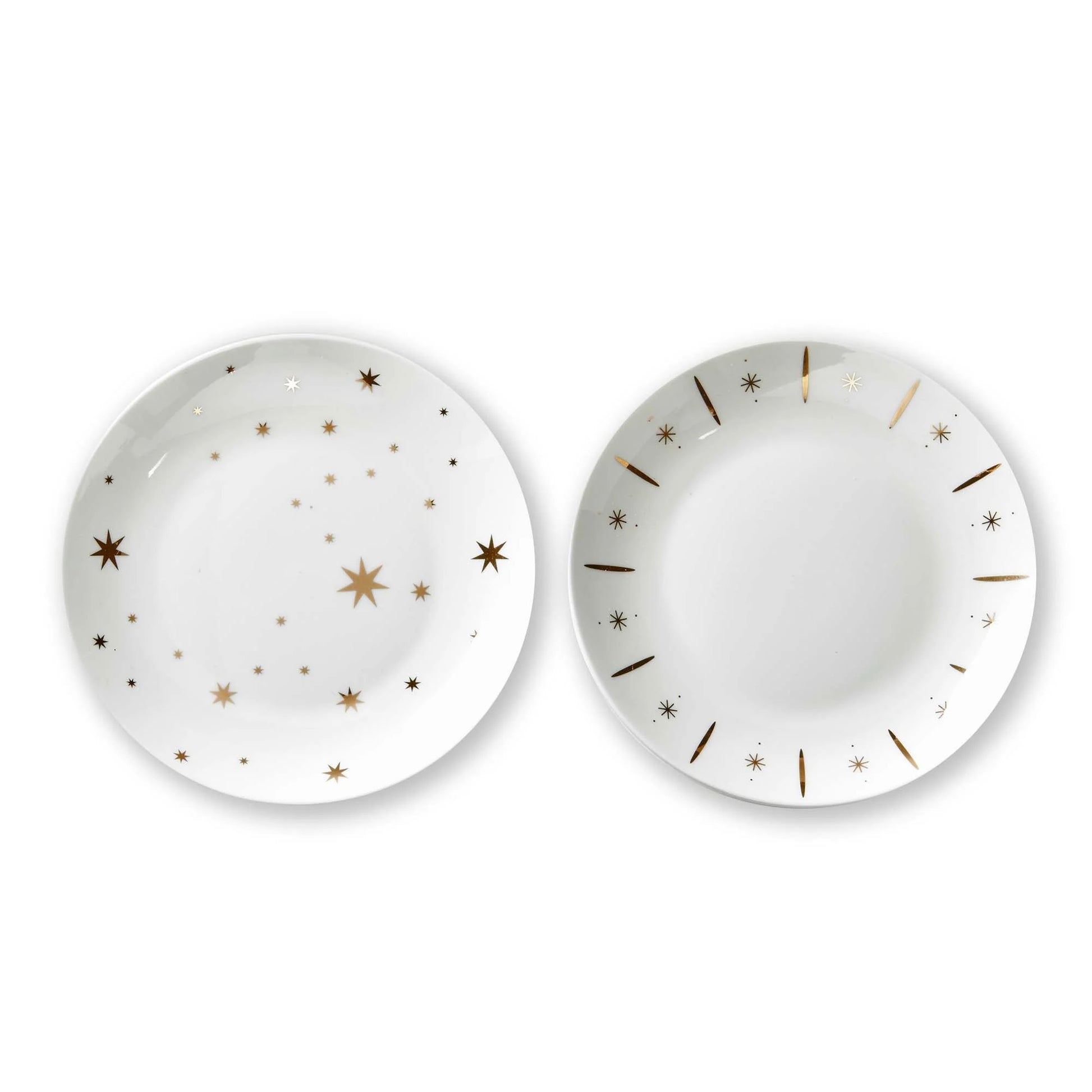 This elegant assortment includes two appetizer plates, each featuring a star design. Made from bone china with a gold finish, they add a touch of luxury to any table.