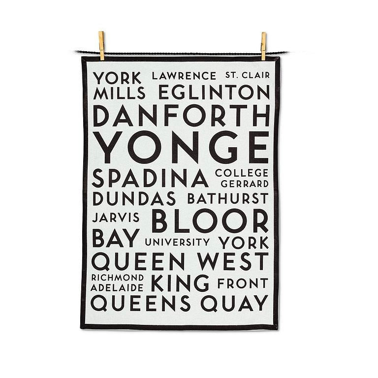Bring a bit of Hogtown to your kitchen decor with this fun Toronto Streets kitchen towel. This ManMade design – Canadian artist Doug Jackson's line of products inspired by vintage maps and photographs – features a word-collage of Toronto's most well-known streets and avenues in a bold black typeface.