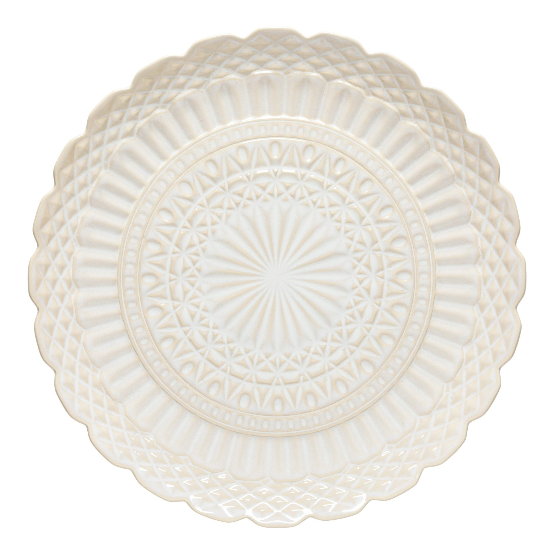 A soft white glaze enhances the detailed surface of the Cristal collection, bringing a lustrous glow to the table.